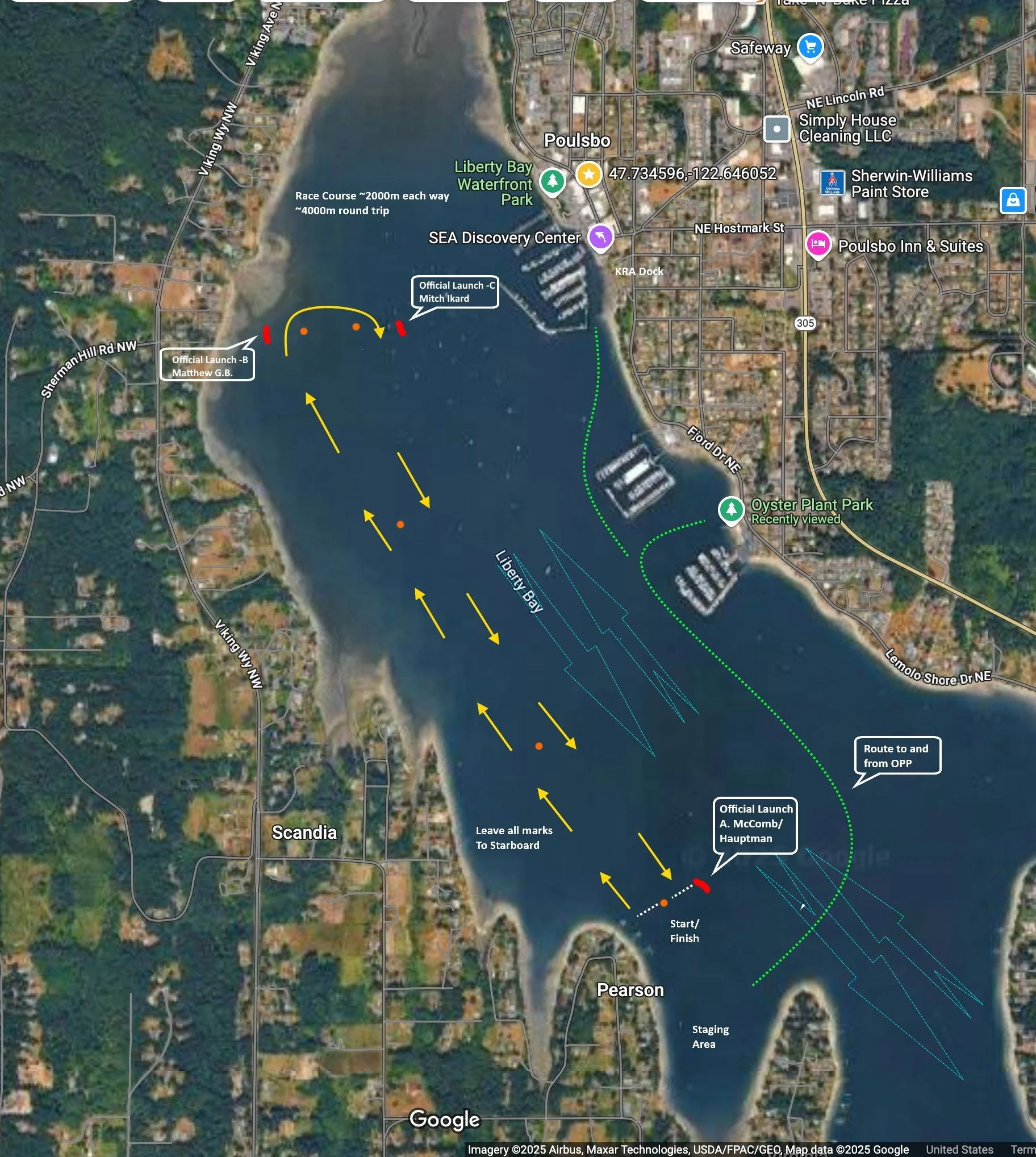 In previous years, KRA and other local clubs have taken turns to host an annual regatta to honor KRA’s founder, Bill Richards. As an additional opportunity to bring together the local rowing community, KRA introduced the Kitsap Invitational Summer Scrimmage (KISS). For 2025 these events are being combined as BRMR/KISS, to be held on Sunday August 3rd from 6:30 am to 12:00 noon in the Port of Poulsbo. This “ham and egg” style rowing regatta, co-hosted by KRA and Bainbridge Island Rowing, involves four- and eight-person rowing shells and one-, two-, or four-person rowing sculls, from several West Sound rowing clubs (Bainbridge Island Rowing, Clam Island Rowing, Kitsap Rowing Association, Olympic Peninsula Rowing Association, Rat Island Rowing and Sculling Club, Sequim Bay Rowing and Paddling Association, Tuf’ as Nails).